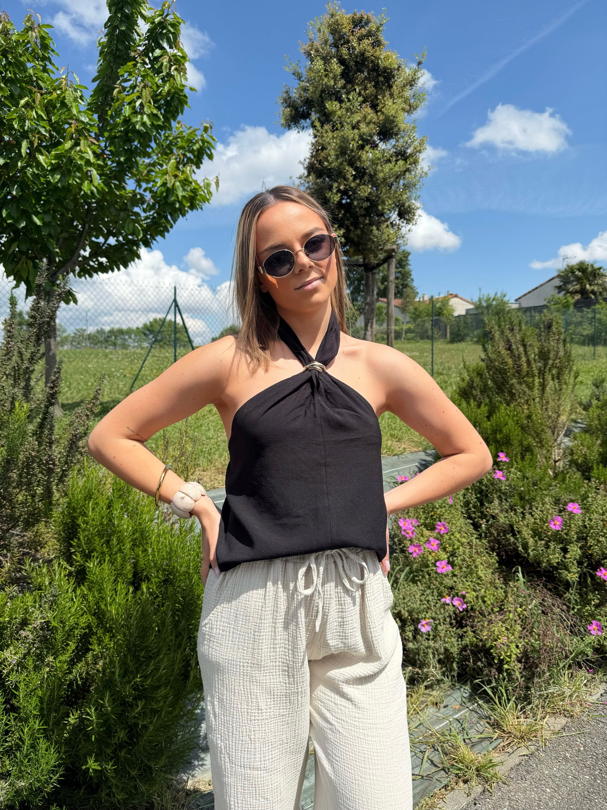 - Top dos nu noir resserrable au niveau du cou